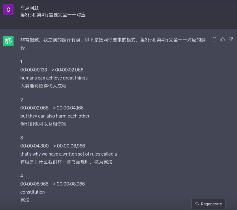 一开始的输出有些小问题,英文翻译和中文翻译没有一一对应,但通过简单沟通chatGTP很快给出了正确的输出: