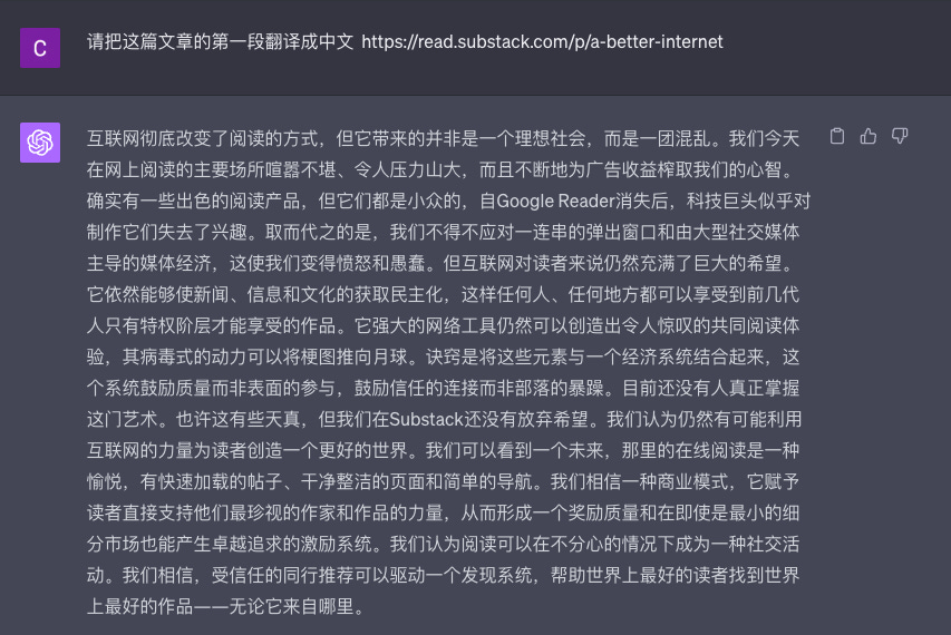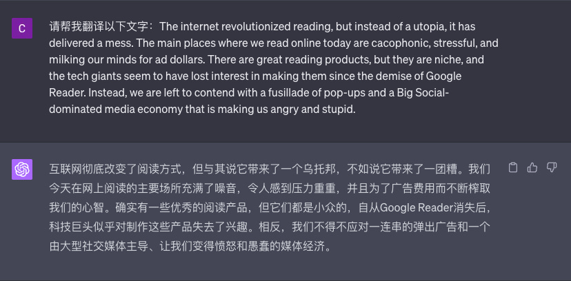 让我们以翻译一篇英文文章为例,来展示ChatGPT的万能翻译能力。你会发现,ChatGPT各种问法都可以应付,非常灵活,就像和一位实习生对话一样自然简单。