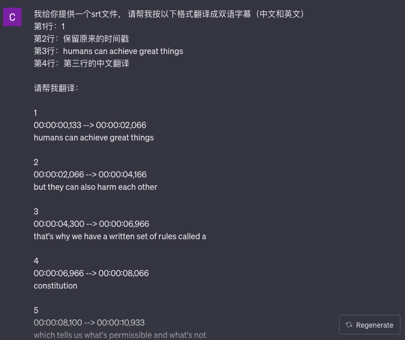 对于更为复杂的翻译任务,比如视频创作者可以使用ChatGPT将其打造成网上最强的双语字幕制作工具。使用GPT-3.5版本就已足够应对各种需求。